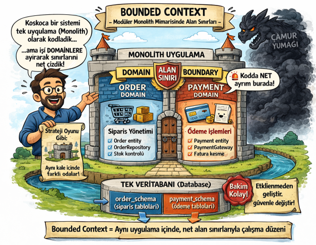 Domain boundary, Modular Monolith mimarisinin en kritik parçasıdır. Çoğu sistemin başarısız olmasının sebebi yanlış teknoloji seçimi değil, yanlış boundary tanımıdır.